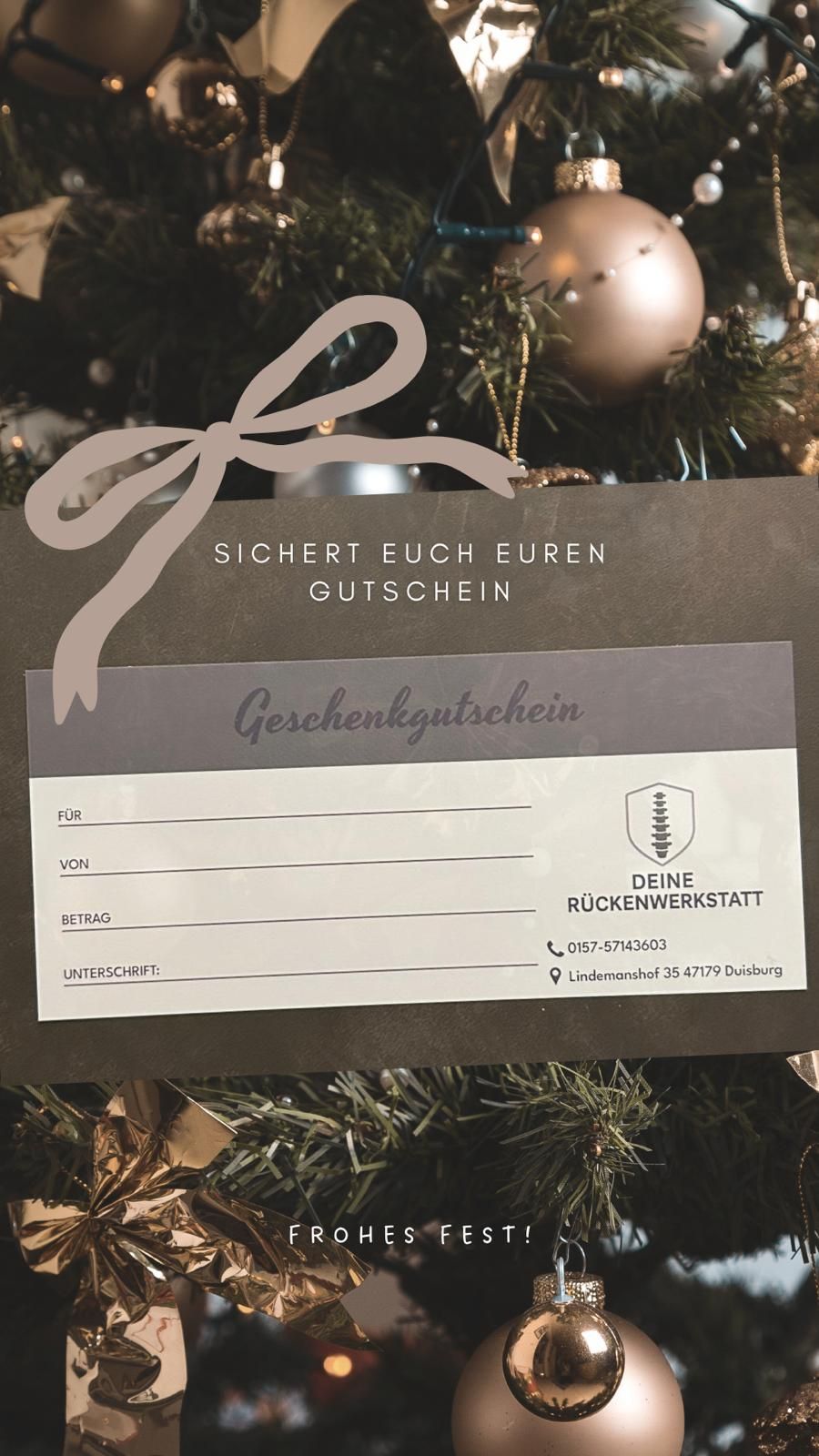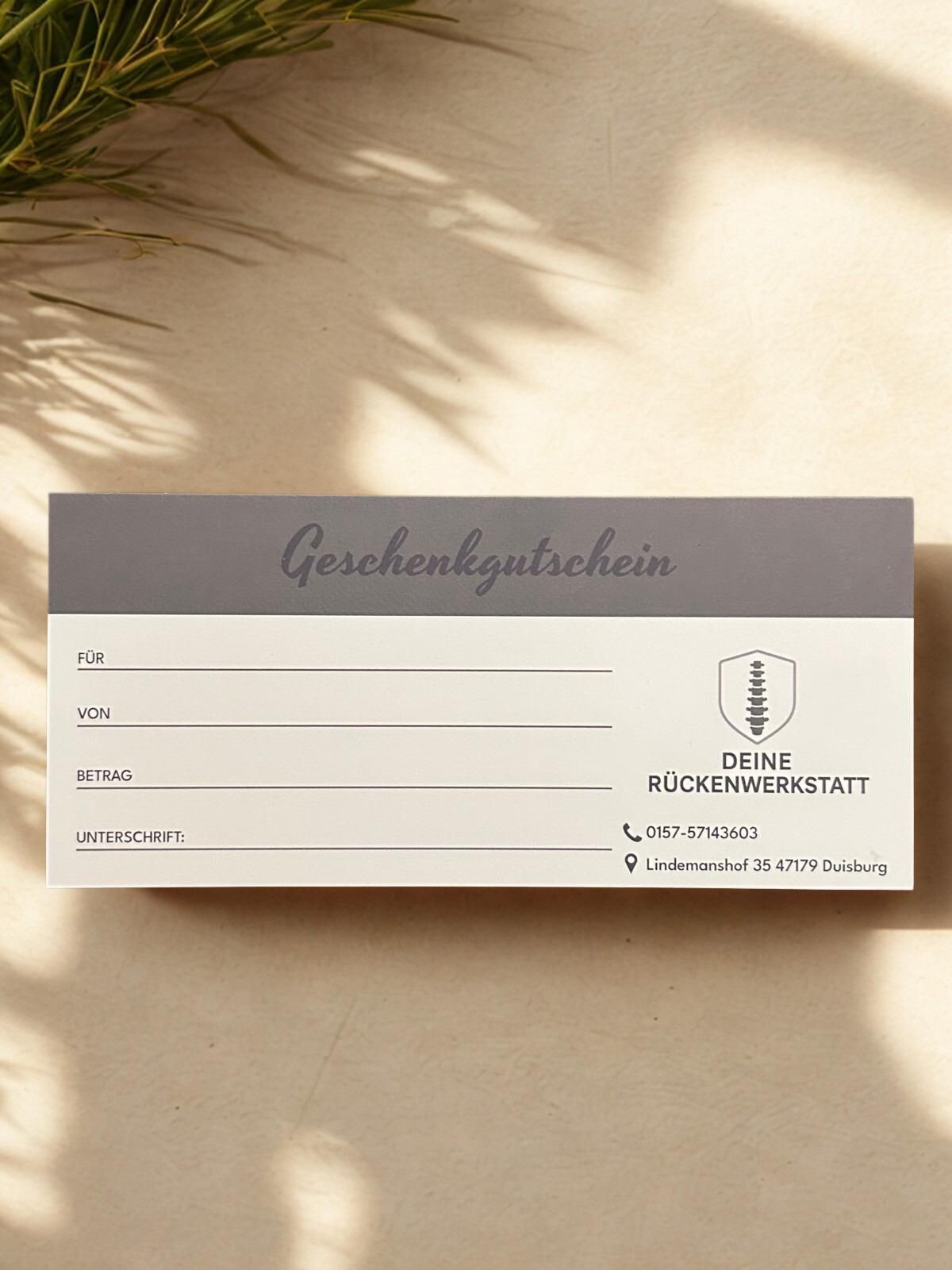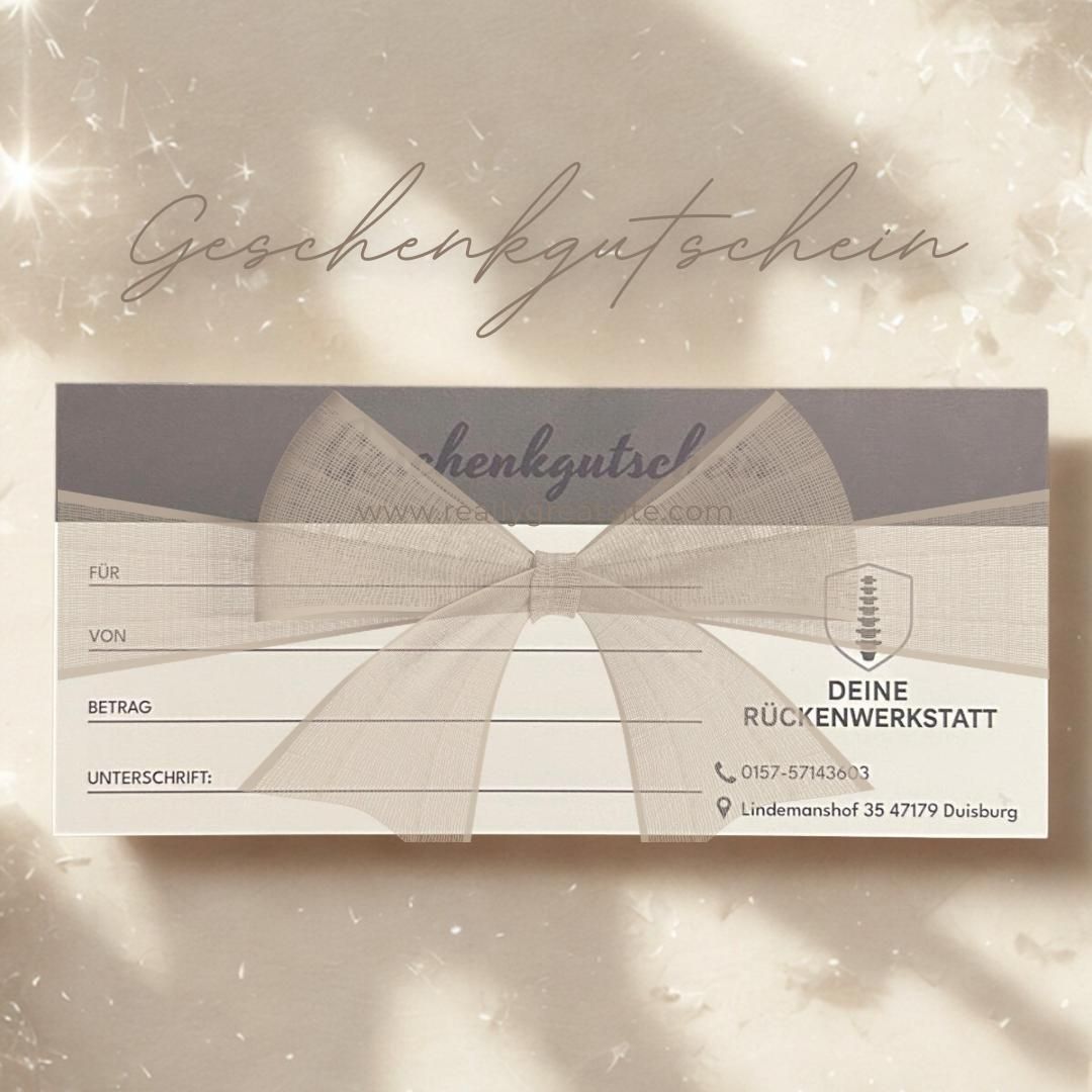 Auf Wunsch vieler Klientinnen und Klienten können Sie bei Deine Rückenwerkstatt einen Gutschein für die Erstbehandlung oder Nachbehandlung bestellen – bequem und kostenfrei per Post zu Ihnen nach Hause.